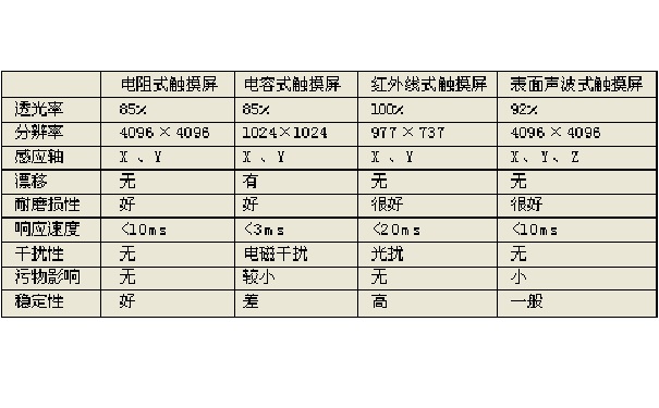 各種觸摸屏都是依靠傳感器來工作的,甚至有的觸摸屏本身就是一套傳感器。它們各自的定位原理和各自所用的傳感器決定了觸摸屏的反應速度、可靠性、穩定性和壽命。各類觸摸屏的技術特性如表1所示。
