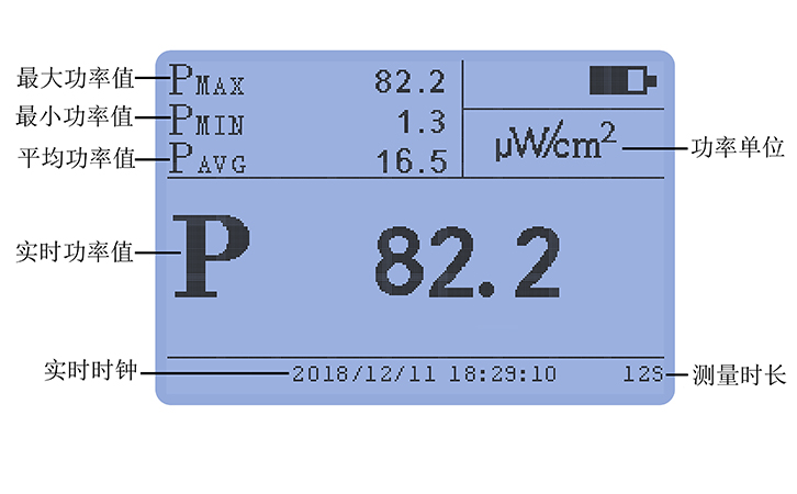 3.智能統計功能:測試時儀器會顯示測量功率的單位,最大值,最小值,平均值以及實時值,在屏幕的最下方還能顯示測量時長與日期。